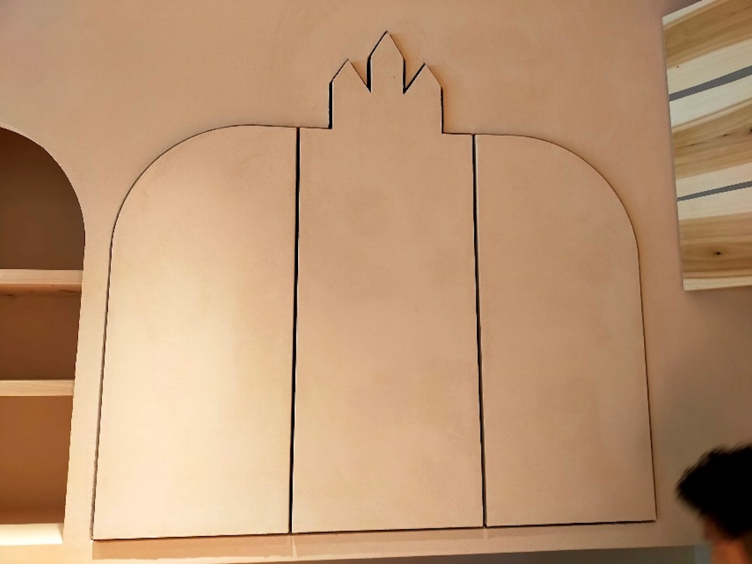 兵庫県神戸市にあるパン屋さんの什器です。 下地をラワンベニヤで製作し、漆喰を塗って仕上げています。