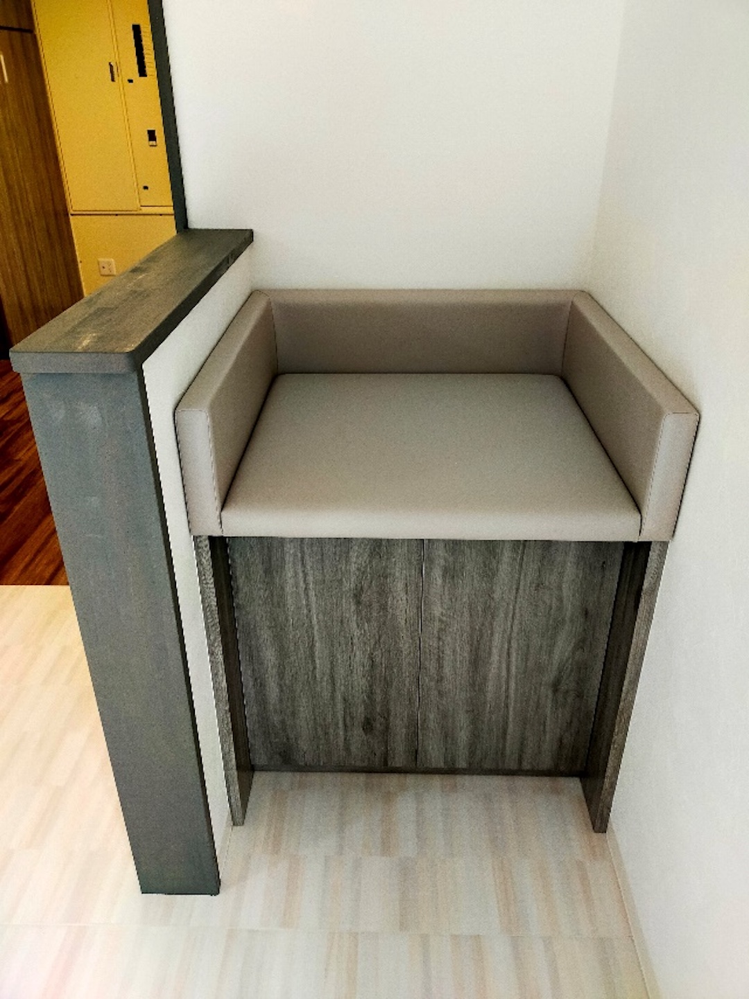 正面玄関にはゴム集成材で製作し、自然塗料で着色したルーバーを取付しました。 内側は図書コーナーとなっており、ルーバーにそってR型のベンチを製作しました。